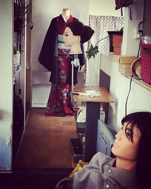 手前はメンズモデルアンディ。撮影が終わって、くつろぎ中。浮いている生首はかんざし撮影用の、新人ロン毛モデル。